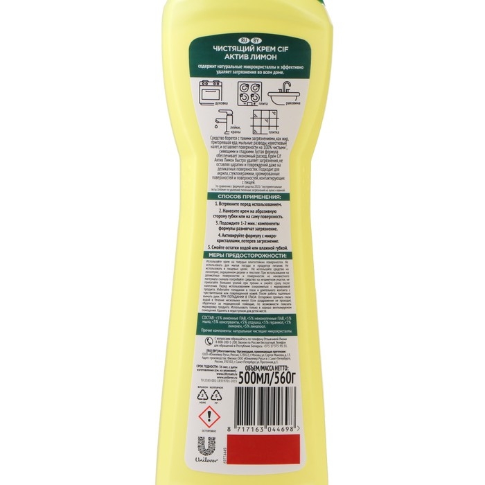 поверхностей. Легко нанести, легко протереть, легко смыть. Крем проникает и полностью удаляет такие въевшиеся и застарелые загрязнения, как засохший жир, пригоревшая еда, мыльные разводы и известковый налет. При том он не царапает поверхность и обладает приятным свежим лимонным запахом. Улучшенная текстура
