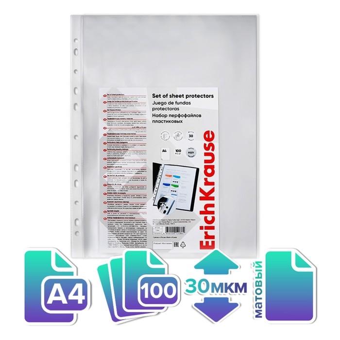 Матовые прозрачные файлы-вкладыши формата А4 из высококачественного прозрачного пластика с текстурой поверхности "апельсиновая корка", на которой не видно отпечатков пальцев и мелких царапин. Предназначен для подшивки бумаг в папки без перфорирования дыроколом. Коллекция: «Clear»