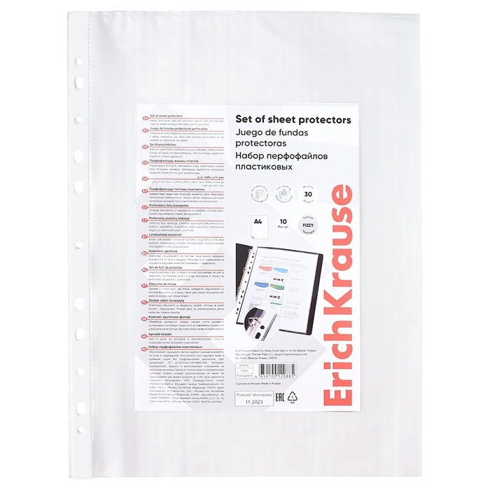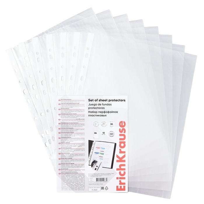 Матовые прозрачные файлы-вкладыши формата А4 из высококачественного прозрачного пластика с текстурой поверхности "апельсиновая корка", на которой не видно отпечатков пальцев и мелких царапин. Предназначен для подшивки бумаг в папки без перфорирования дыроколом. Коллекция: «Clear»