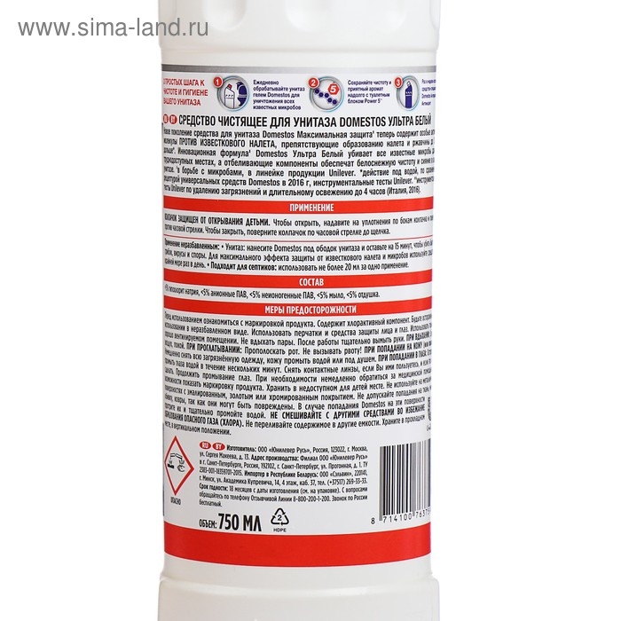Чистящее средство Domestos "Ультра белый", гель, для унитаза, 750 мл