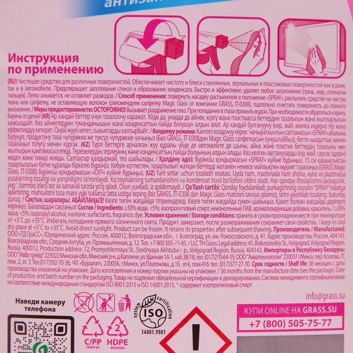 Чистящее средство для различных поверхностей. Обеспечивает чистоту и блеск стеклянных, зеркальных и пластиковых поверхностей как в доме, так и автомобиле. Предотвращает запотевание стекл и образование конденсата. Быстро и эффективно удаляет любое загрязнение (грязь, жир, отпечатки пальцев). Легко смывается, не оставляет разводов.