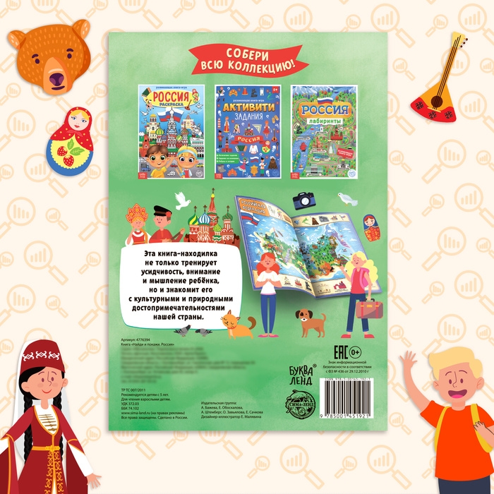 Эта книга-находилка не только тренирует память, усидчивость и внимание ребёнка, но и знакомит его с культурными и природными особенностями нашей страны.