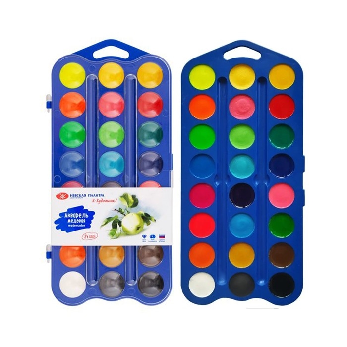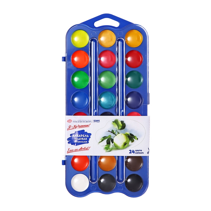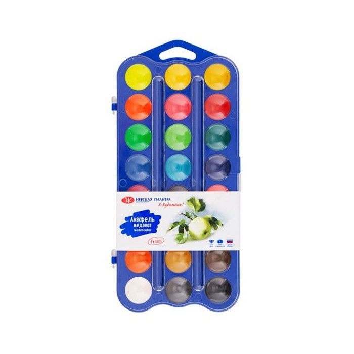 В составе набора медовой акварели 12 базовых цветов и 12 дополнительных. Набор выпускается в пластиковом пенале небольшого размера, что позволяет значительно экономить место в рюкзаке. Крышку упаковки можно использовать в качестве палитры. Поскольку производителем является признанный лидер в производстве профессиональных художественных материалов, акварельные краски "Я-Художник!" отличаются высокой чистотой цвета и яркостью. Даже при нанесении тонкого слоя краски цвет рисунка получается ярким, и что особенно важно для детей – не меняет свой цвет после высыхания. Краски легко набираются на влажную кисть и легко разносятся, ровно ложатся на бумагу. Тонкость перетира пигмента обеспечивает нанесение краски без образования точек и пятен. После высыхания краски не растрескиваются вне зависимости от толщины нанесенного слоя.