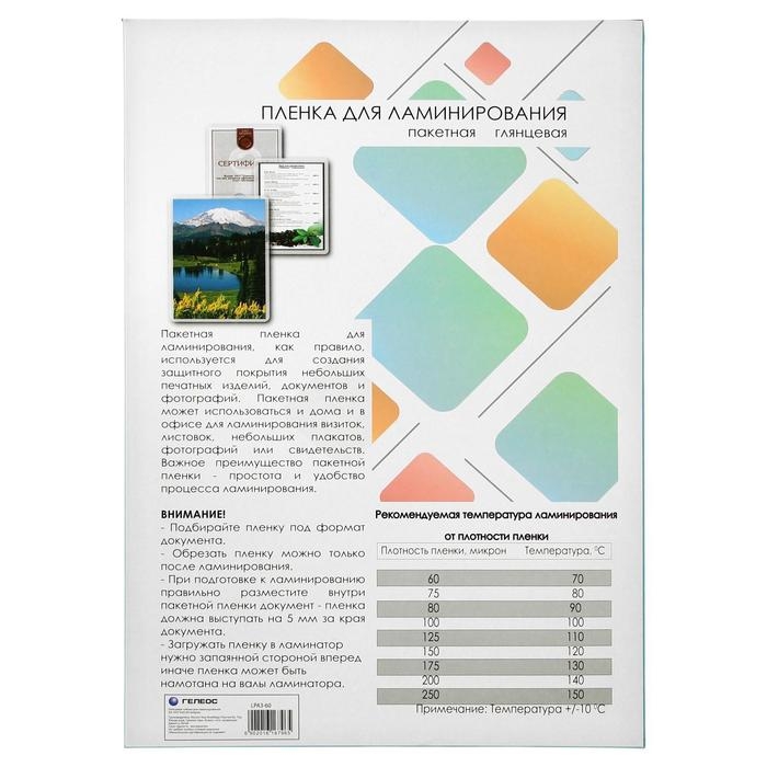 Пленка для ламинирования A3 303х426 мм, 60 мкм, 100 штук, глянцевые, Гелеос