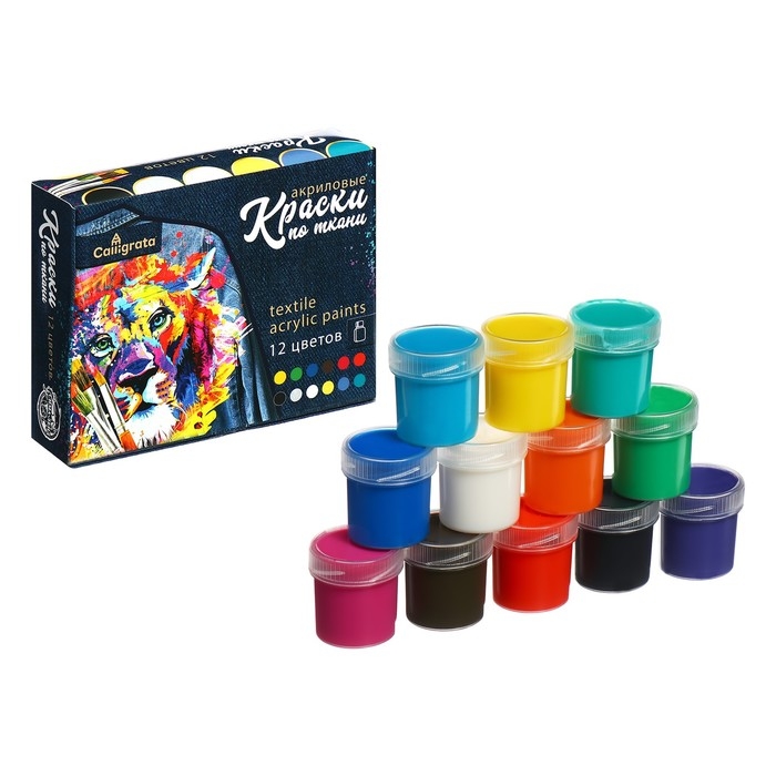 Краска по ткани, набор 12 цветов х 20 мл (10 основных цветов + золото и серебро), МОРОЗОСТОЙКАЯ, акриловая на водной основе, Calligrata