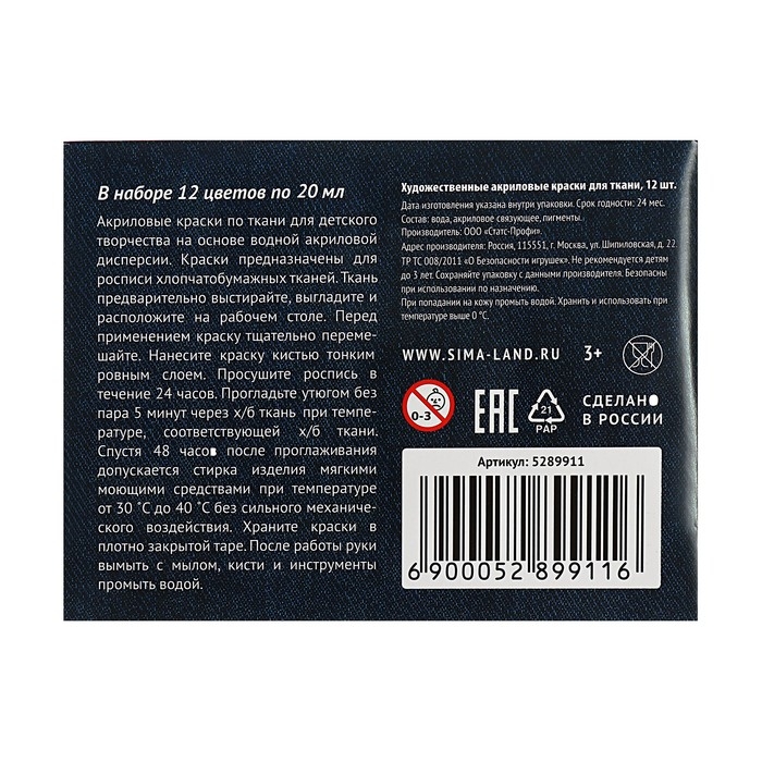 Краска по ткани, набор 16 цветов х 15 мл, ЗХК "Я - Художник!", акриловая на водной основе (228411819)