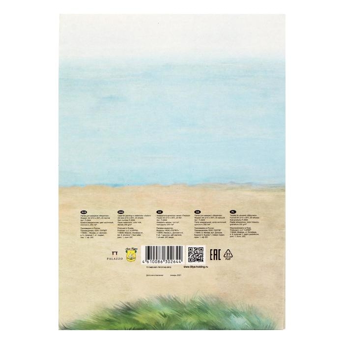Папка состоит из 20 листов бумаги приятного оттенка натурального бумажного волокна, устойчива к старению и не содержит кислот. Лицевая сторона имеет легендарную зерновую структуру, обратная сторона матовая, не зернистая, что позволяет использовать разные техники рисования: акварель, гуашь, темпера. Благодаря своим свойствам, акварельная бумага выдерживает смывки, подчистки, способна к наполнению глубины красочного слоя и сохранению его яркости, обладает мягкой эстетической фактурой.