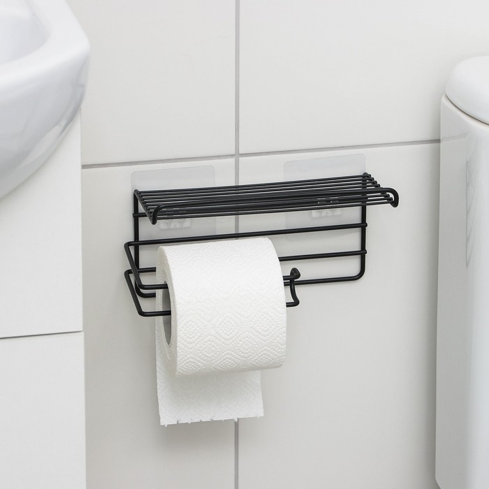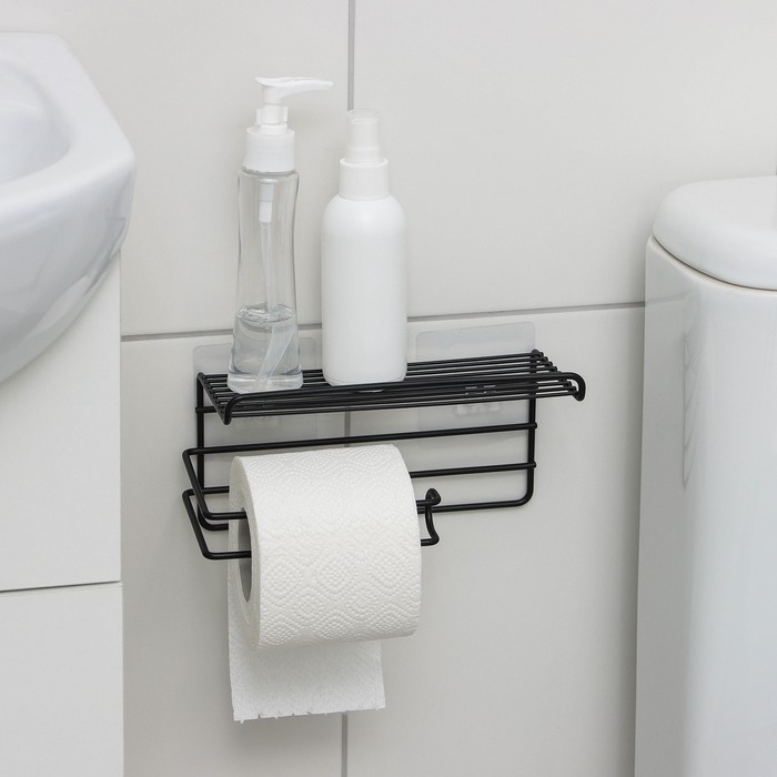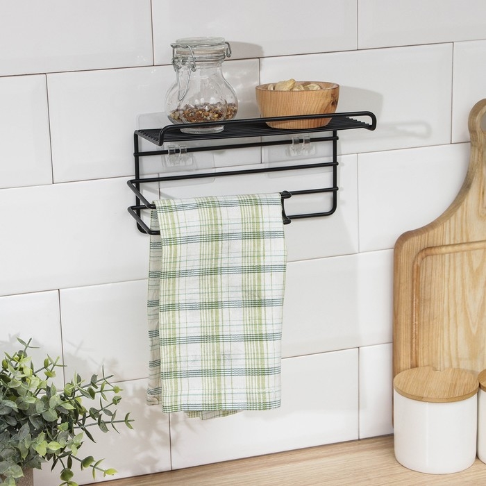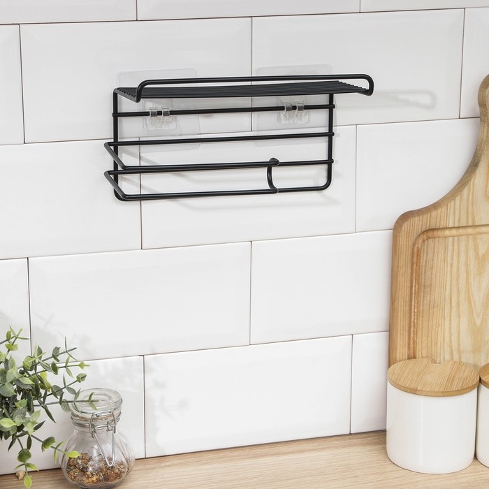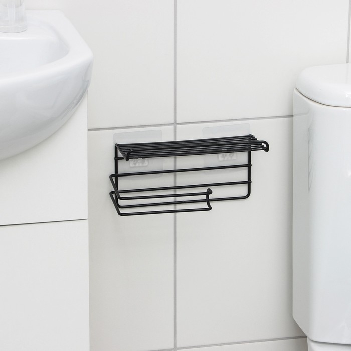 Полка на липучке Доляна, с держателем для полотенец, 19,5×9,5×8 см, цвет черный