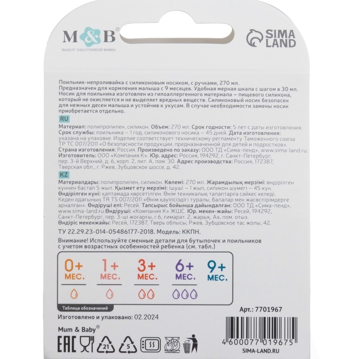 Качество товара подтверждается сертификатом соответствия ЕАС. Поильник выполнен из безопасного пластика, предназначенного для производства детской посуды.
