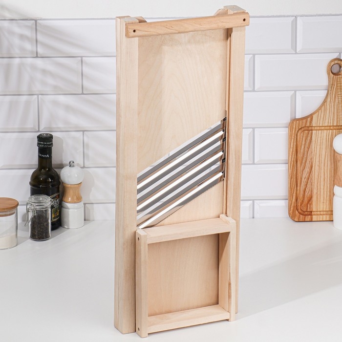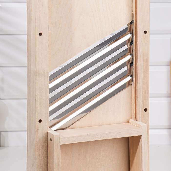 Ручная шинковка позволяет быстро и без особых усилий нарезать овощи. Изделие выполнено из дерева, имеет острое лезвие из высококачественной стали.