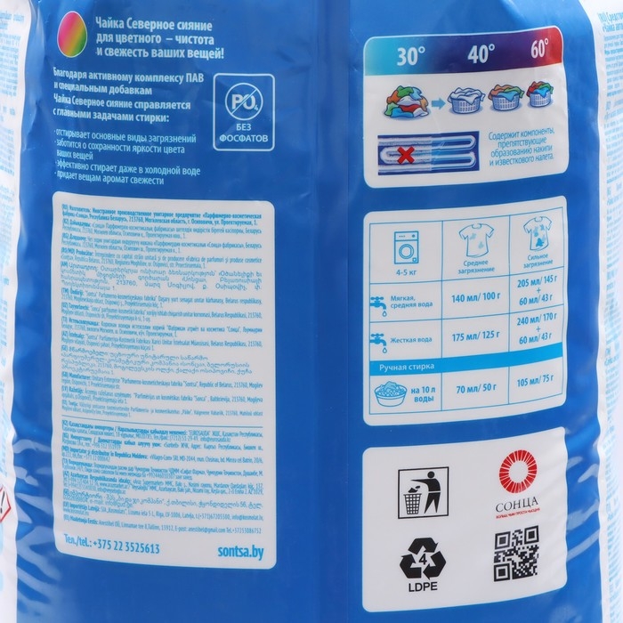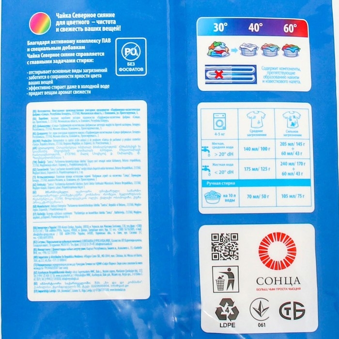 Стиральный порошок для цветного и темного белья эффективно отстирывает цветные вещи, обеспечивая сохранность цвета и бережное отношение к волокнам ткани. Не содержит фосфаты.