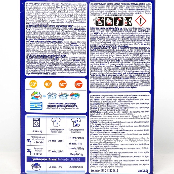 Способ применения: 100 г порошка на 4-5 кг белья, для ручной стирки 70 г порошка на 10 л воды.