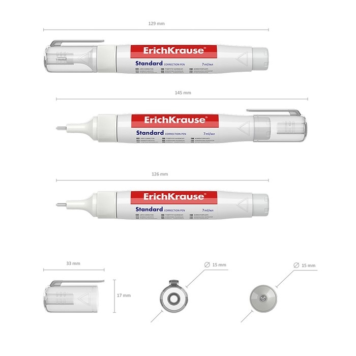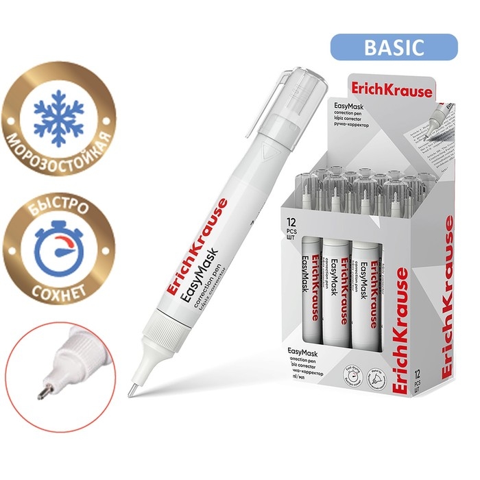 Ручка-корректор с быстросохнущей корректирующей жидкостью для точечных исправлений. Показывает отличный результат на всех типах и цветах чернил. Высококачественный металлический наконечник обеспечивает плавное движение и экономичный расход. Жидкость удобно наносить локально на необходимый фрагмент, создавая непрозрачный слой, незаметный на ксерокопиях. Морозостойкая. На основе растворителя. Перед применением жидкость необходимо взболтать с помощью внутреннего металлического шарика.