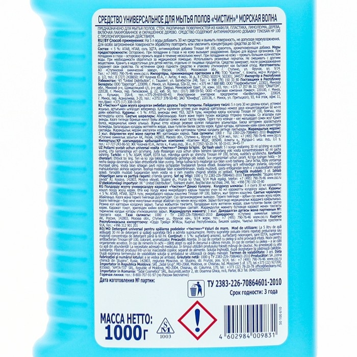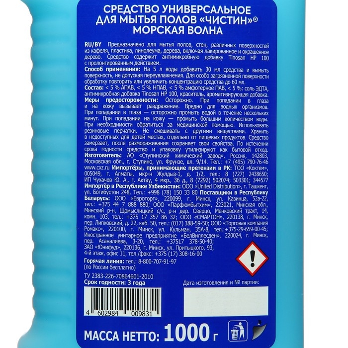 Средство универсальное для мытья полов аромат – Морская волна. Предназначено для мытья полов, стен, различных поверхностей из кафеля, пластика, линолеума, дерева, включая лакированное и окрашенное дерево. Средство содержит добавку Tinosan HP 100 c пролонгированным действием.