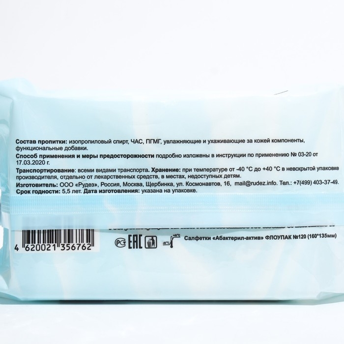 Дезинфицирующе средство представляет собой готовые к применению салфетки из белого нетканого материала Спанлейс (13,6*22 см) высокой прочности, равномерно пропитанные дезинфицирующим средством Абактерил-Актив.