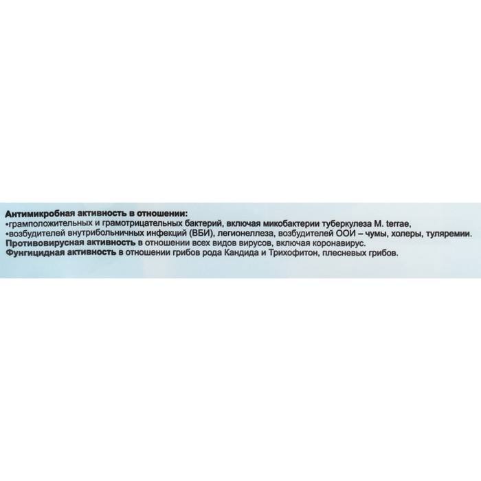 Антибактериальная активность в отношении: грамотрицательных и грамположительных бактерий (включая микобактерии туберкулеза Mycobacterium terrae), кишечных инфекций. Вирулицидная активность в отношении всех известных вирусов-патогенов, в том числе рино-, норо-, рото-, аденовирусов, коронавирусов, вирусов энтеральных и парентеральных гепатитов, полиомиелита, энтеровирусов Коксаки, вич-инфекций, вирусов гриппа и парагриппа, вирусов герпеса, кори, возбудителей орви, вирусов свиного гриппа H1N1 и птичьего гриппа H5N1, цитомегаловирусной инфекции, вируса Эбола и.т.д., легионеллеза. Фунгицидная активностью в отношении грибов рода Кандида, Трихофитон, плесневых грибов. Особо опасные инфекции (ООИ) - чума, холера, туляремия.