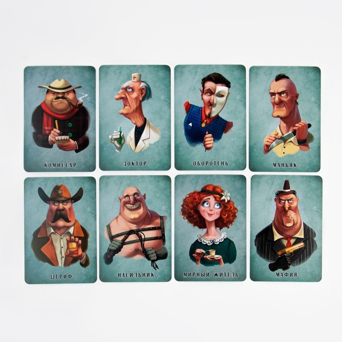 В колоде 18 игровых карточек: 9 мирных жителей, 2 мафии, 2 насильника, маньяк, комиссар, шериф, оборотень, доктор. Материал: картон. Возраст: 18+