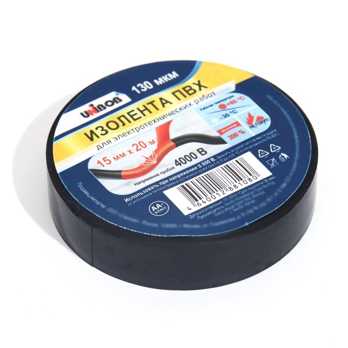 Клейкая лента электроизоляционная UNIBOB 15мм х 20м, 130мкм, черная рекомендована при проведении электроизоляционных работ. При наложении одного витка на другой происходит самовулканизация, образуется монолитный слой изоляции, что гарантирует долговременную герметичность.