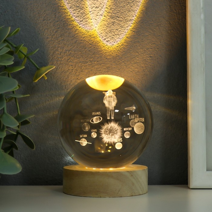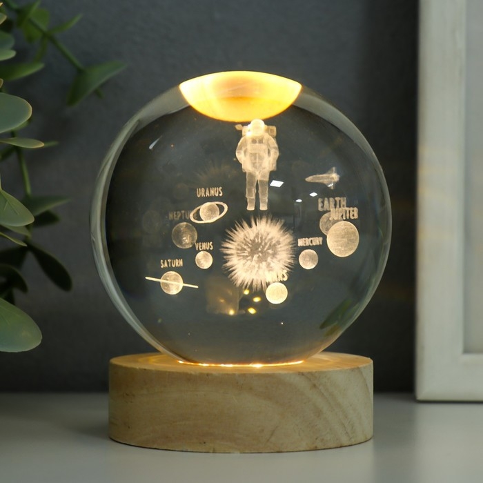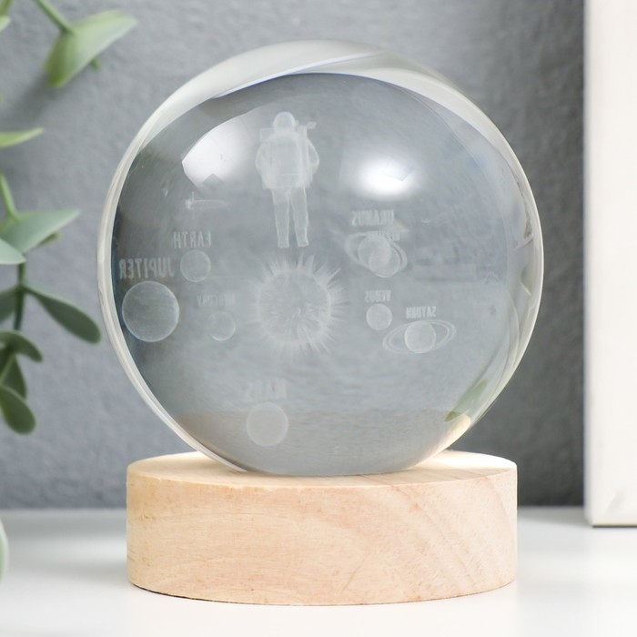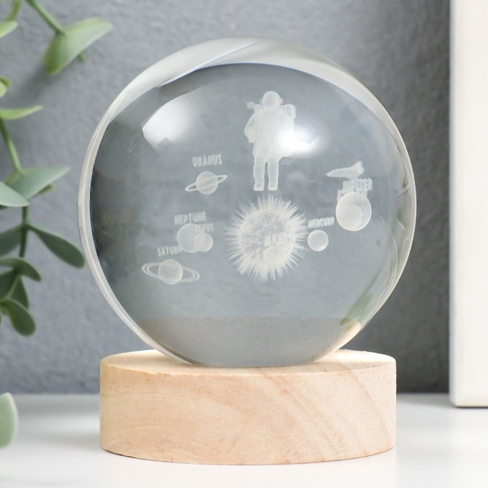Сувенир стекло подсветка "Космонавт и планеты" d=8 см подставка дерево, USB 8х8х9,5 см