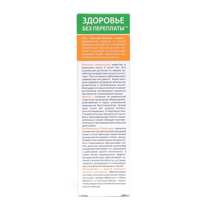 Гель-бальзам "Суставит Окопник Здоровые колени" с мумием является продуктом, разработанным для ухода за суставами и облегчения дискомфорта в области колен. Он содержит мумиё, которое является природным компонентом, известным своими потенциальными преимуществами для суставов.