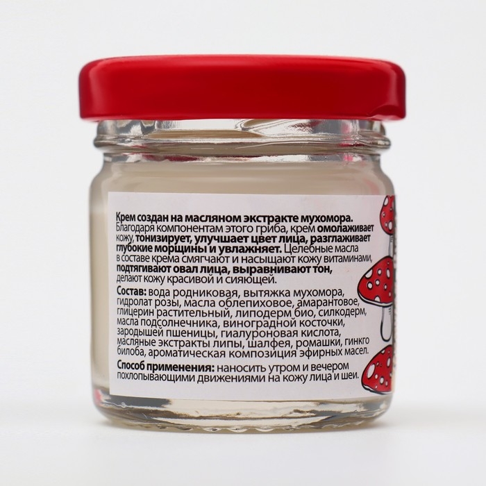 Крем создан на масляном экстракте мухомора. Благодаря компонентам этого гриба, крем омолаживает кожу, тонизирует, улучшает цвет лица, разглаживает глубокие морщины и увлажняет. Целебные масла в составе крема смягчают и насыщают кожу витаминами, подтягивают овал лица, выравнивают тон, делают кожу красивой и сияющей.
