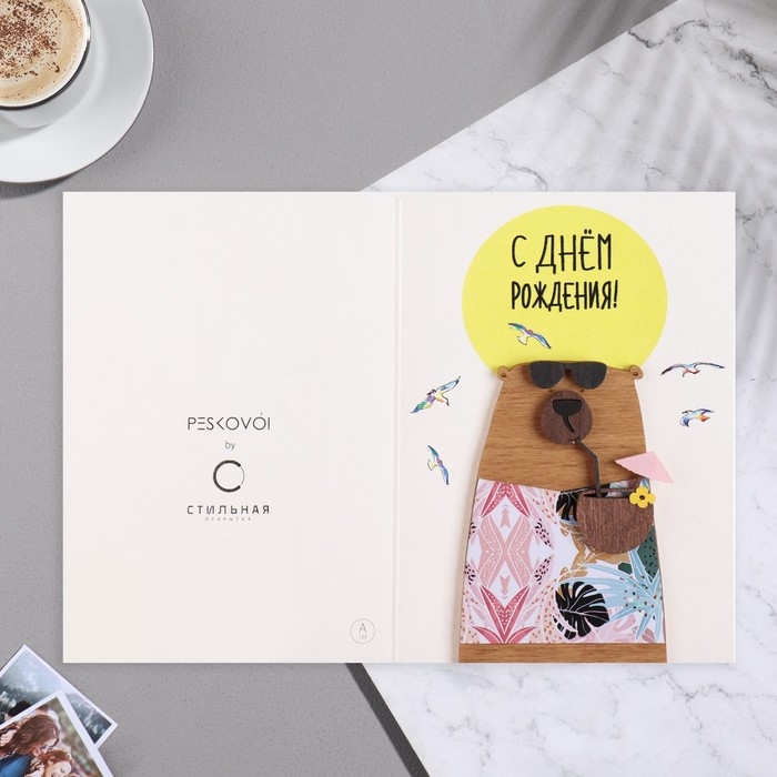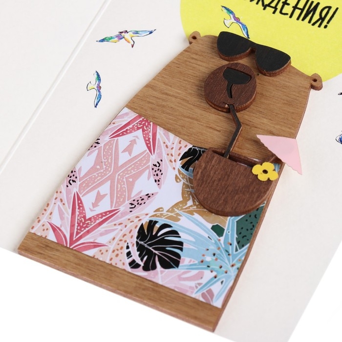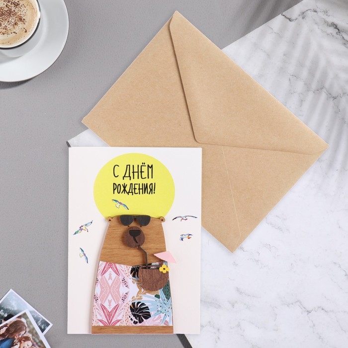 Открытка с деревянным элементом "С Днем Рождения!" ручная работа, кокос, 14,7х10,5 см