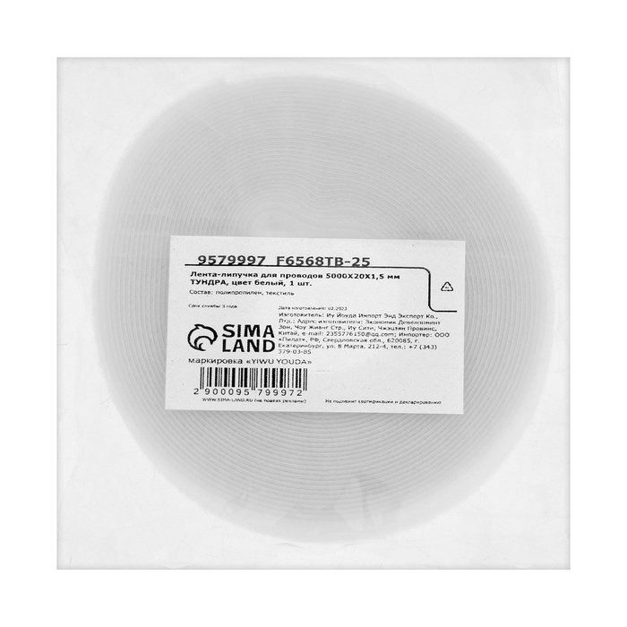 Лента-липучка для проводов 5000Х20Х1,5 мм ТУНДРА, цвет белый, 1 шт.