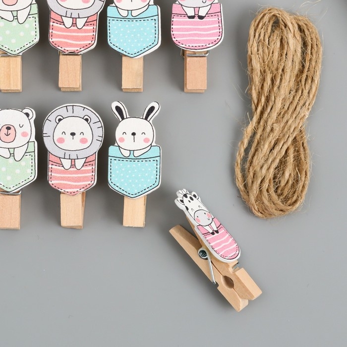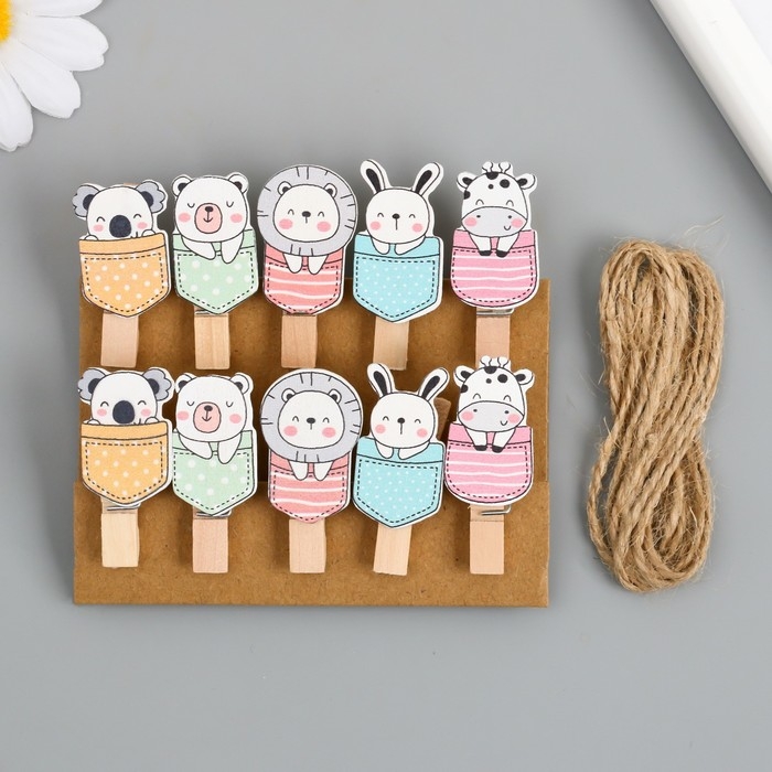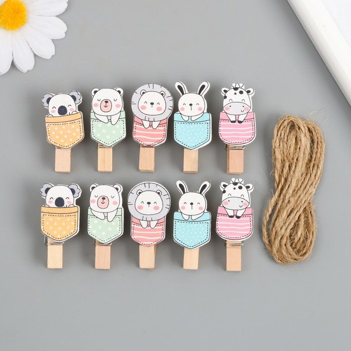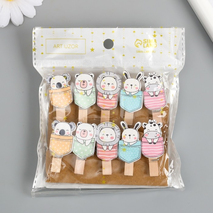 Декор для творчества дерево "Прищепка. Зверята в кармашках" набор 10 шт 3,8х2х1,2 см