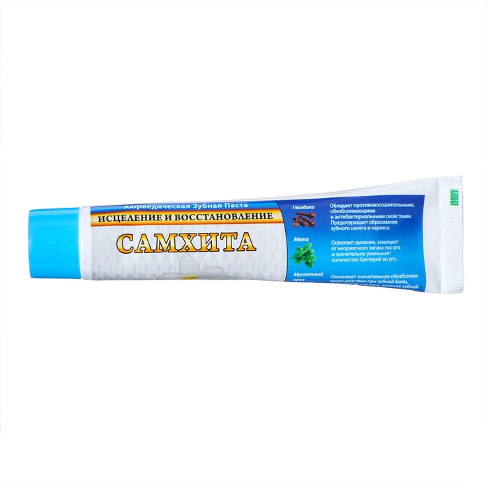 Зубная паста Самхита "Исцеление и Восстановление" не содержит парабенов, силиконов и других вредных веществ, поэтому безопасна для здоровья полости рта. Она помогает защитить зубы от кариеса и предотвращает образование зубного налета.