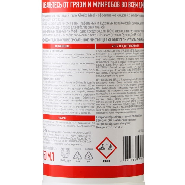 Универсальный чистящий гель Glorix Ультра гигиена — это эффективное средство для поддержки чистоты и гигиены во всем доме. Антибактериальный Глорикс МЕД гель способствует уничтожению плесени, грибков и бактерий и может использоваться для очищения различных поверхностей в ванной, туалете, на кухне. Glorix MED гель применяется для обработки кафеля, плиты, кухонных столешниц, губок для мытья посуды, отбеливания белья. Густая гелевая текстура помогает экономно расходов средство и верно отмерять его дозировку. Гель Glorix быстро высыхает после обработки поверхностей.