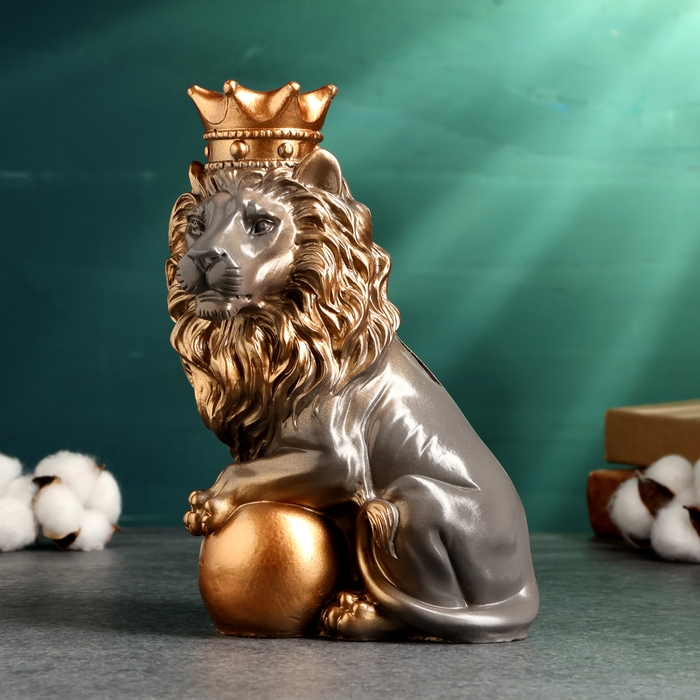 Копилка "Лев с короной и шаром сидит" серый с бронзой, 23см