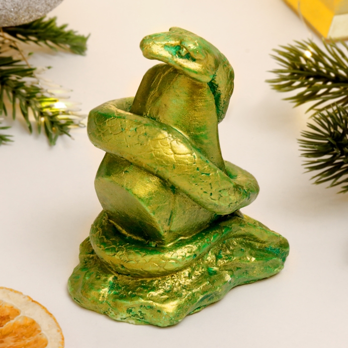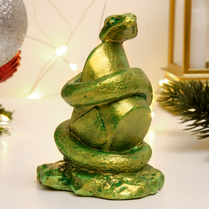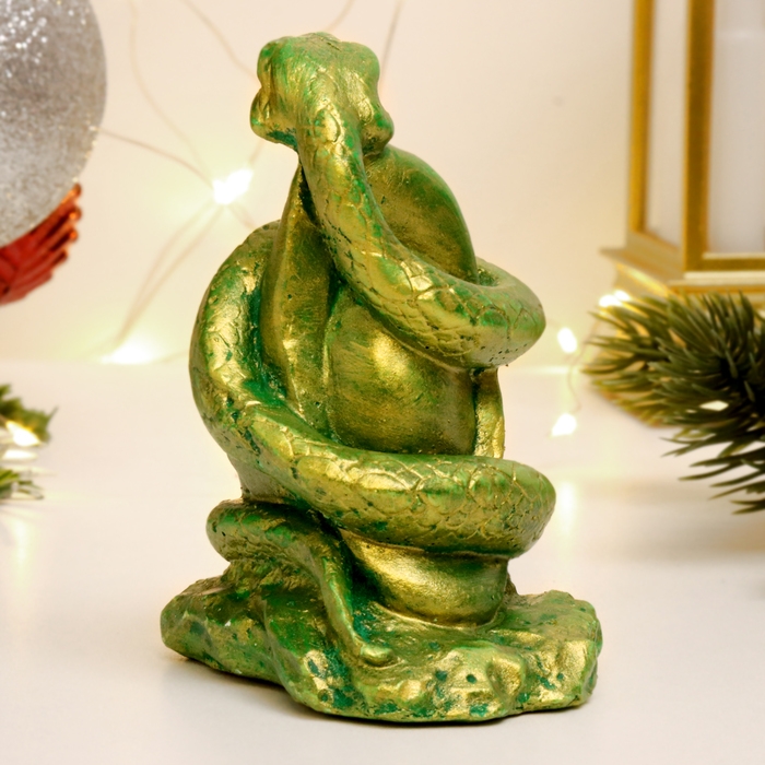 Новый год. Символ 2025. Фигура "Змея на камне" зеленый с позолотой, 9х7х5см