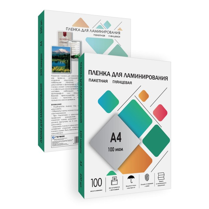 Пленка для ламинирования A4 216х303 мм, 100 мкм, 100 штук, глянцевые, Гелеос