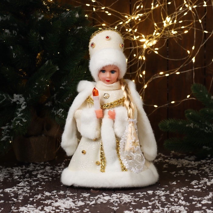 Снегурочка "В шубке с бусинками и в кокошнике" двигается, с подсветкой, 30х18 см, золото