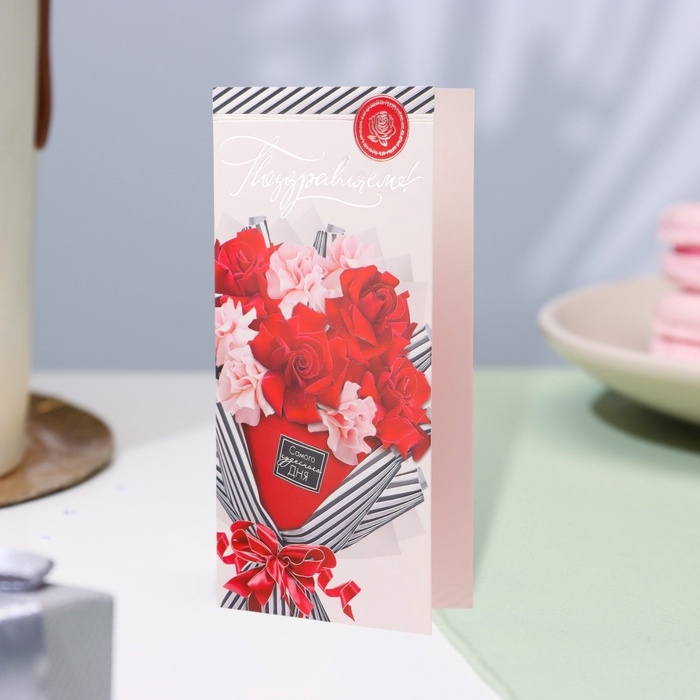 Открытка-евро "Поздравляем!" конгрев, тиснение, красный цветы, 10,5 х 21,5 см