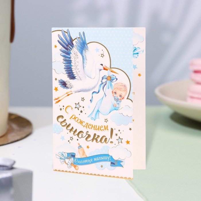Открытка "С рождением сыночка!" конгрев, тиснение, аист, 12,5 х 19,4 см