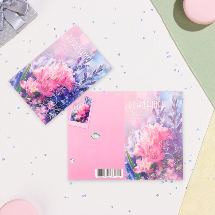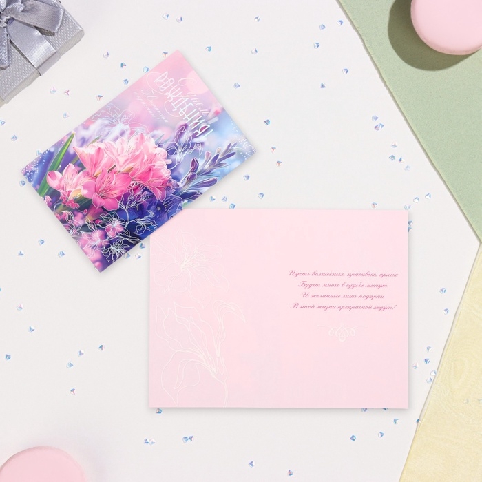 Открытка "С Днём Рождения!" конгрев, тиснение, розово-сиреневый цвет, 12,5 х 19,4 см