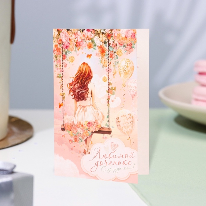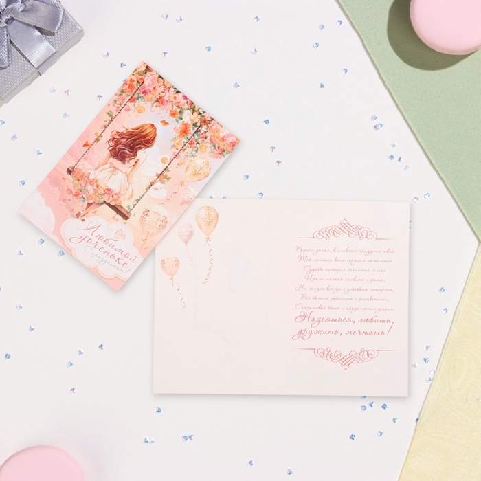 Открытка "Любимой доченьке!" глиттер, конгрев, качели, 12,5 х 19,4 см