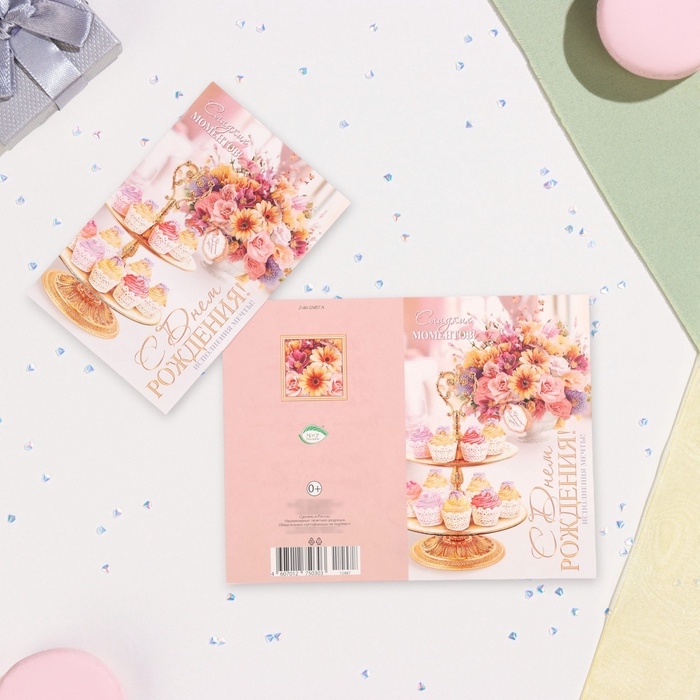 Открытка "С Днём Рождения!" глиттер, конгрев, пирожные, 12,5 х 19,4 см
