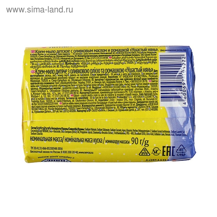 Детское крем-мыло Ушастый нянь — это идеальное сочетание натуральных ингредиентов и мягкого воздействия на кожу вашего малыша. Натуральные ингредиенты: мыло содержит оливковое масло и экстракт ромашки, которые обладают успокаивающими и противовоспалительными свойствами. Они бережно ухаживают за кожей ребёнка, не вызывая раздражений и аллергии. Мягкое воздействие: крем-мыло образует мягкую пену, которая легко смывается водой, не оставляя ощущения стянутости или сухости кожи. Это делает его идеальным для ежедневного использования. Универсальность: Ушастый нянь подходит для мытья рук, тела и волос ребёнка. Вы можете быть уверены, что ваш малыш будет чистым и свежим в течение всего дня. Экономичность: упаковка содержит четыре бруска мыла, которых хватит на долгое время. Детское крем-мыло Ушастый нянь — это отличный выбор для заботливых родителей, которые хотят обеспечить своему малышу максимальный комфорт и безопасность.