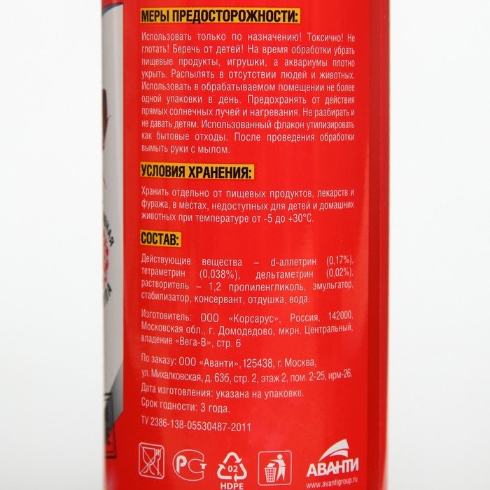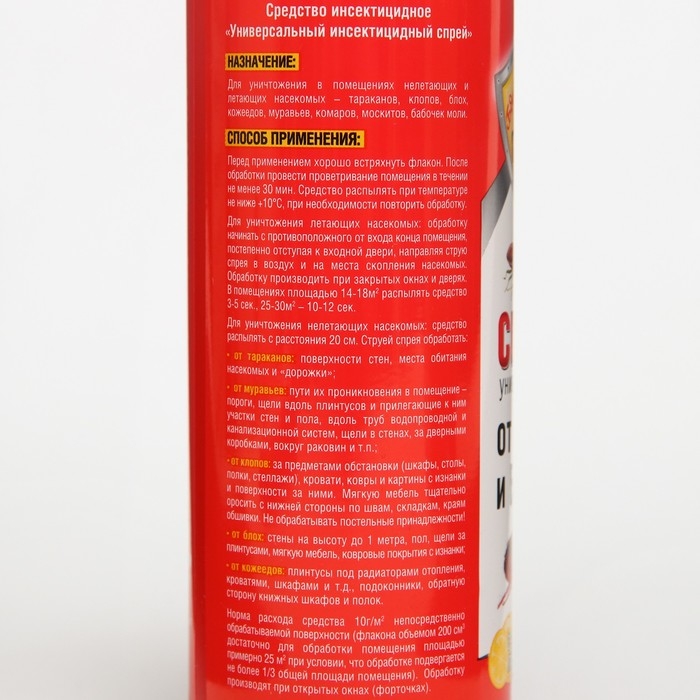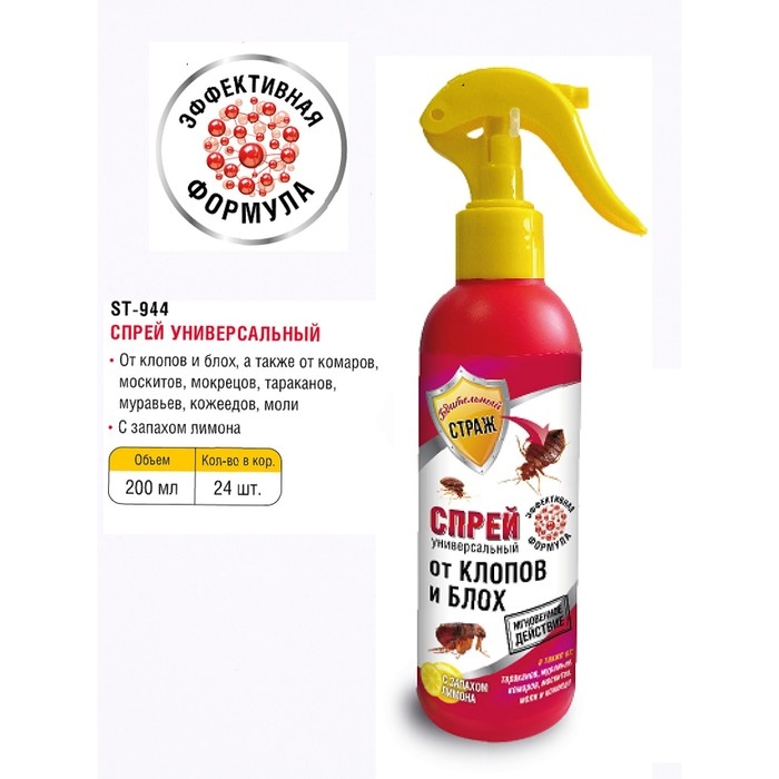 Бдительный страж спрей универсальный от клопов и блохБдительный страж Спрей универсальный от клопов, блох, а также тараканов , муравьев , комаров, моли , кожееда 200 млПрименение:Перед применением хорошо встряхнуть флакон.После обработки провести проветривание помещения в течении не менее 30 мин.Средство распылять при температуре не ниже +10С, при необходимости повторить обработку.Норма расхода средства 10г/ кв. м ( флакона объемом 200 мл достаточно для обработки помещения площадью примерно 25 кв. мДля уничтожения летающих насекомых : обработку начинать с противоположного от входа конца помещения , постепенно отступая к входной двери, направляя струю спрея в воздух и на места скопления насекомых.Обработку производить при закрытых окнах и дверях. В помещениях площадью 14-18 кв. м распылять средство 3-5 сек, 25-30 кв. м -10-12 сек.Для уничтожения нелетающих насекомых: средство распылять с расстояния 20 см.Струей спрея обработать:от тараканов: поверхности стен, места обитания насекомых и "дорожки"от муравьев: пути их проникновения в помещение -пороги, щели вдоль плинтусов и прилегающие к ним участки стен и пола, вдоль труб водопроводной и канализационной систем, щели в стенах , за дверными коробками, вокруг раковин и т. п;от клопов: за предметами обстановки( шкафы, столы, полки, стелажи), кровати, ковры и картины с изнанки и поверхности за ними. Мягкую мебель тщательно оросить с нижней стороны по швам, складкам, краям обшивки . Не обрабатывать постельные принадлежности!от блох: стены на высоту до 1 метра , пол, щели за плинтусами, мягкую мебель , ковровые покрытия с изнанки.от кожеедов: плинтусы под радиаторами отопления, кроватями, шкафами и т. д, подоконники, обратную сторону книжных шкафов и пол