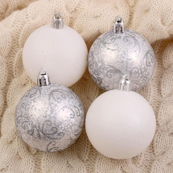 Набор шаров пластик d-6 см, 9 шт "Морозные узоры" белый, серебро