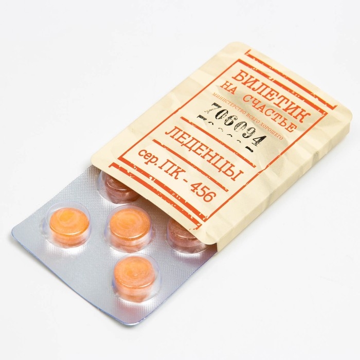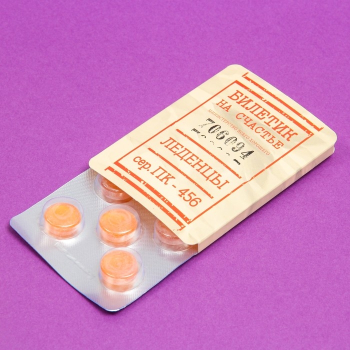 Упаковка жевательной резинки с шуточной надписью "Счастливый билет" – отличный сюрприз для близкого человека или коллеги. Жвачка в форме маленьких разноцветных шариков упакована в блистер, имеет приятный сладкий вкус апельсина. А шутливое упаковка в виде билета поможет поднять настроение в любой ситуации.