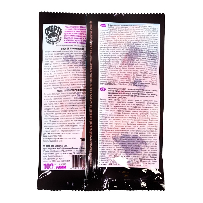 - битрекс (горький компонент), не влияющий на поедаемость грызунов, но предохраняющий приманку от поедания птицами и снижает опасность случайного отравления людей, а так же нецелевых видов животных.