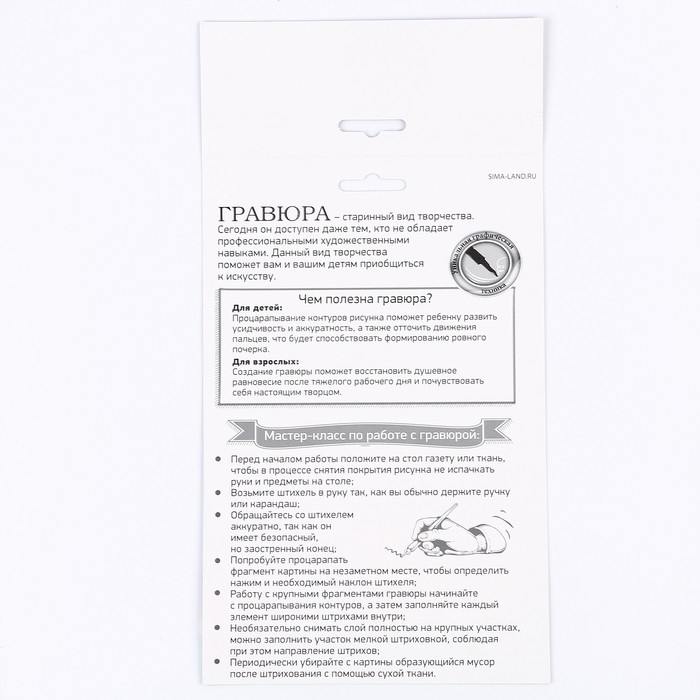 Гравюра представляет собой многослойное панно, покрытое чёрной краской, на которое нанесён контур рисунка. С помощью особого скребка (штихеля), который входит в набор, путём процарапывания и создается гравюра.