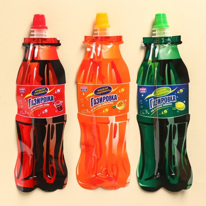 Состав: глюкозный сироп, сахар, питьевая вода, регуляторы кислотности (лимонная кислота, яблочная кислота), консервант (сорбат калия), ароматизатор (кола/лимон), краситель Е150/Е102.