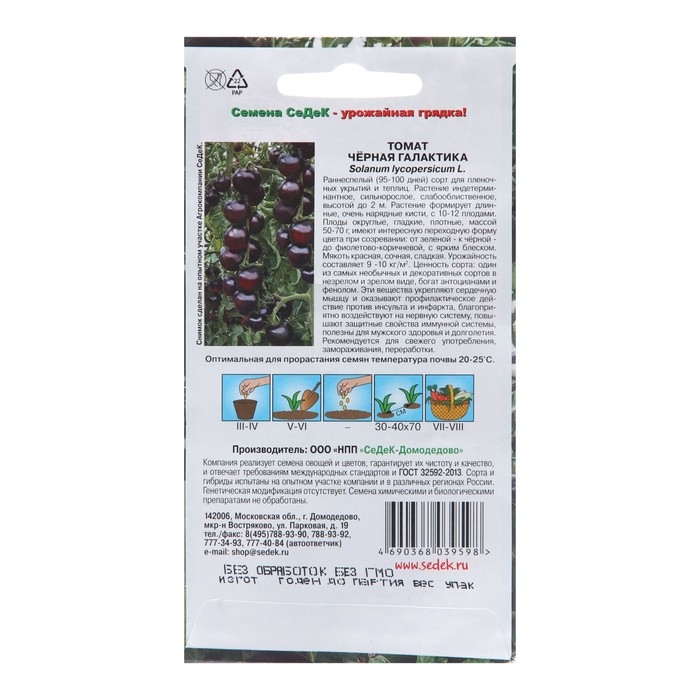 Раннеспелый (95-100 дней) сорт для пленочных укрытий и теплиц. Растение индетерминантное, сильнорослое, слабооблиственное, высотой до 2 м. Растение формирует длинные, очень нарядные кисти, с 10-12 плодами. Плоды округлые, гладкие, плотные, массой 50-70 г, имеют интересную переходную форму цвета при созревании: от зеленой - к чёрной - до фиолетово-коричневой, с ярким блеском. Мякоть красная, сочная, сладкая. Урожайность составляет 9 -10 кг/м2. Ценность сорта: один из самых необычных и декоративных сортов в незрелом и зрелом виде, богат антоцианами. Эти вещества укрепляют сердечную мышцу и оказывают профилактическое действие против инсульта и инфаркта, благоприятно воздействуют на нервную систему, повышают защитные свойства иммунной системы, полезны для мужского здоровья и долголетия. Рекомендуется для свежего употребления, замораживания, переработки.