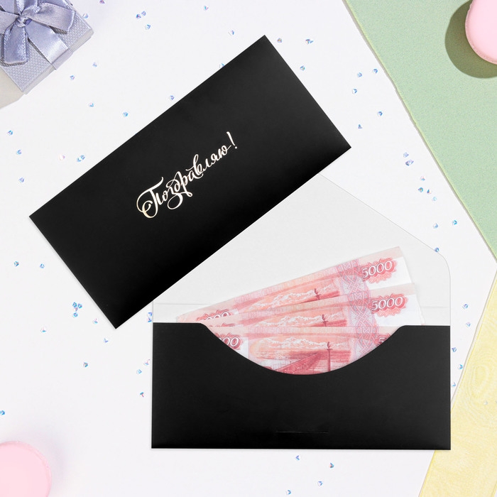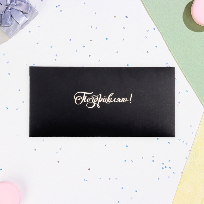 Конверт для денег "Поздравляю!" золото на черном, тиснение, 16,5 х 8 см
