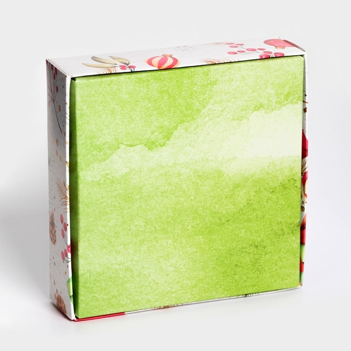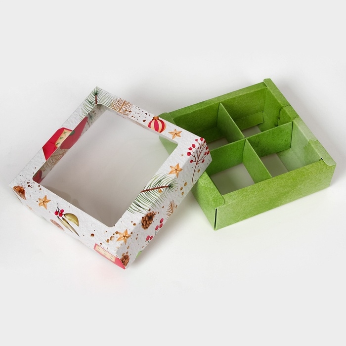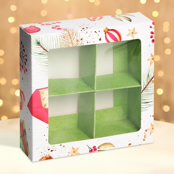 Коробка под 4 конфеты "Новогодняя" размером 12,6 х 12,6 х 3,6 см - это прекрасный выбор для упаковки сладостей к празднику. Она выполнена в ярких новогодних цветах, что создает атмосферу праздника и волшебства.