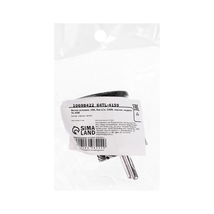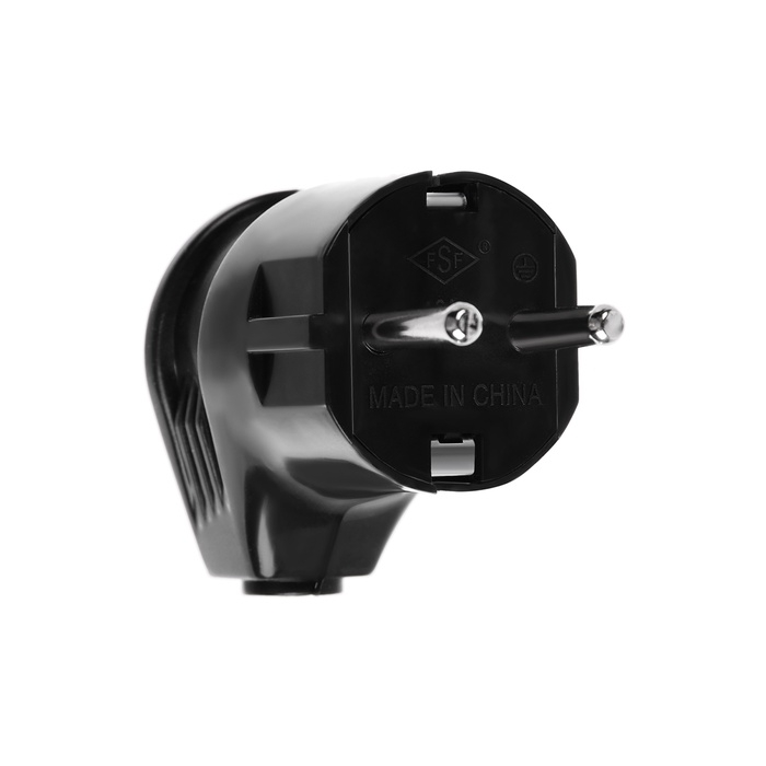 Вилка угловая, 10А, без з/к, 220В, черная